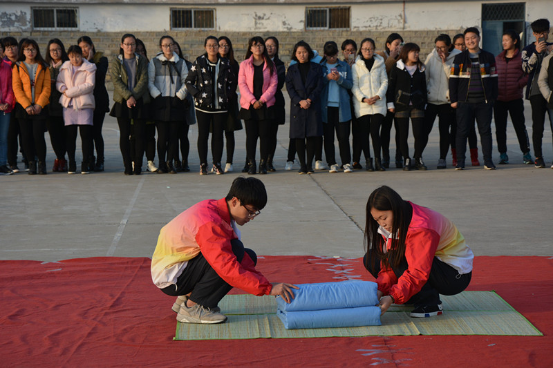 在接下来的叠被子大赛中,各参赛专业班级代表按照要求在规定区域将揉乱的棉被放在凉席上,按照军训时教官的要求,熟练的将被子叠成“豆腐块”形状,四四方方、有棱有角。评委们本着公平公正的原则对同学们的成果进行了打分,并评出了一等奖两名,二等奖四名,三等奖五名。