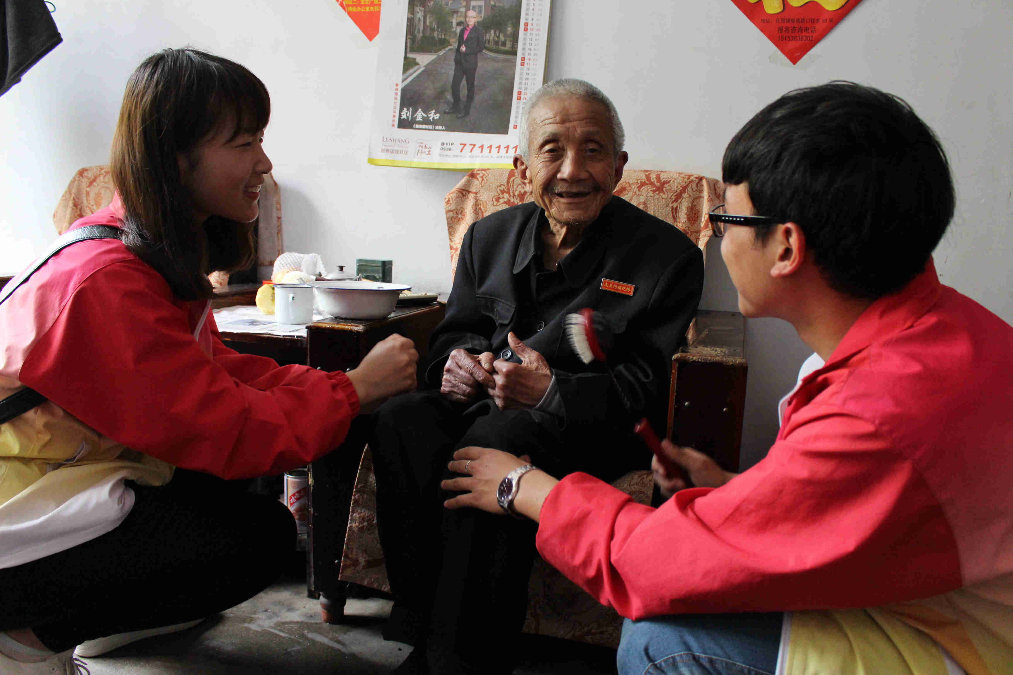 同学们在敬老院负责人的指导下,分工合作,有条不紊的展开各自的工作,有人帮老人晒被子、洗衣服,有人帮老人收拾宿舍,有人扶老人来到院子里晒太阳,还有人给老人捏肩捶腿。交谈中,同学们感受到老人们对老有所养非常的满意,对党和国家的感谢之情无以言表。