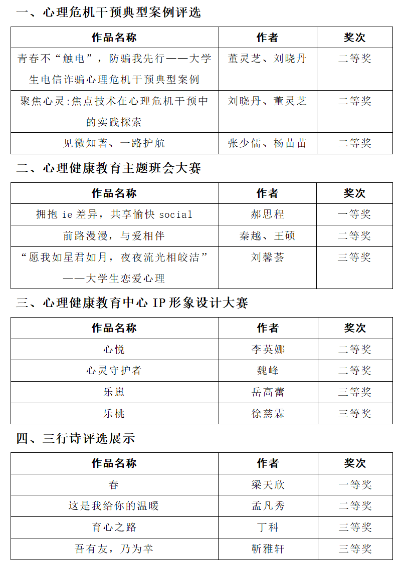 近日,校(院)2024年心理健康教育月展示活动评选结果正式公布,球王会在心理危机干预典型案例、心理健康教育主题班会、心理健康教育中心IP形象设计大赛、“这是我给你的温暖”三行诗评选展示等四个项目中荣获多项奖项。