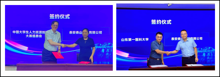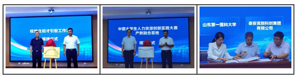 与会领导共同为“校地企招才引智工作站”“中国老员工人力资源创新实践大赛产教融合基地”揭牌。校(院)与泰安高新区、泰安高新科创集团共签校地企三方合作协议,并与泰安泰山科技有限公司签订横向课题委托协议。