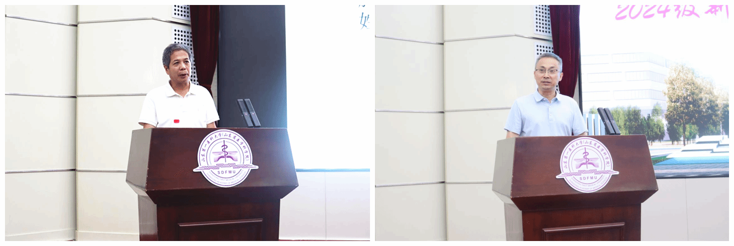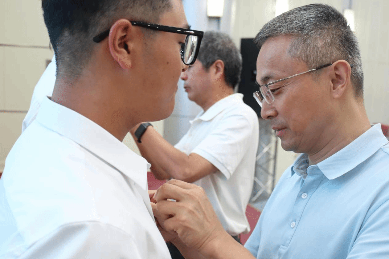 杜江山、陈士福为 2024 级新生佩戴院徽,向新生同学们表达了真诚的祝愿和满满的期望。