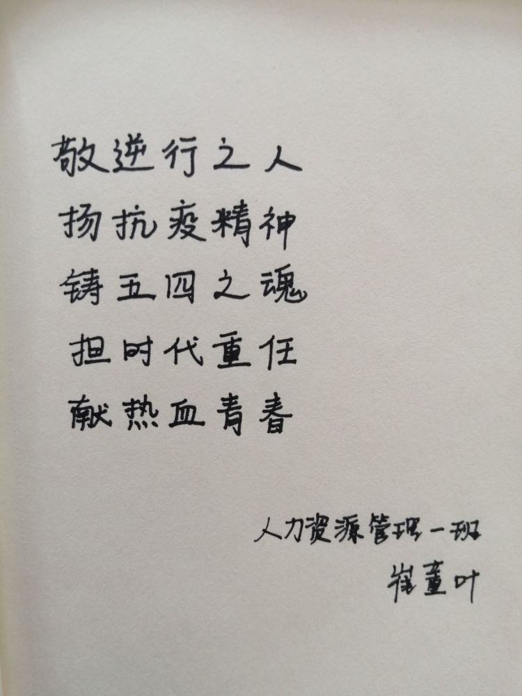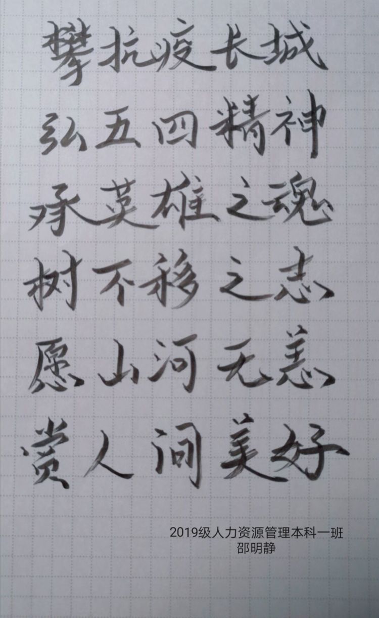 本次标语征集活动旨在用文字凝聚心中力量、用标语歌颂抗疫精神,让大家领悟新时代下五四精神的重要内涵。同学们纷纷积极参与,并采用手写的方式向“逆行者”和“奋斗者”致敬。一笔一捺之间传达着当代青年的担当精神,体现了抗疫过程中国之治的坚定信心。经过评选,最终曹依然、邵明静同学获得一等奖,崔董叶、赵倩艺等四名同学获得二等奖,李冉,高文宇等六名同学获得三等奖。