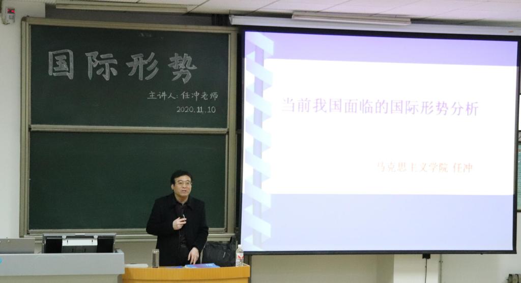 任冲首先介绍了当前国际形势变化,接着谈到美国近年来与中国的对抗和博弈,包括中美贸易战、科技战及台湾问题等,并对问题的原因作了阐述。随后指出,中国发展迎来了历史关键时期,大选后的中美关系只会继续紧张,最后在讲到党的十九届五中全会时,建议同学们仔细阅读党的十九届五中全会报告,认真学习党的十九届五中全会提出的十四五规划和二0三五年远景目标,不断提高自身素质,为实现中华民族两个一百年的伟大奋斗目标贡献青春和力量。