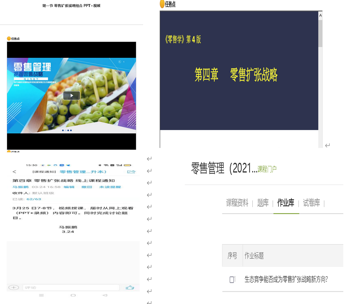 市场营销系马振鹏老师通过学习通平台,向员工发布录播视频和课程PPT,并利用平台数据监控加强员工线上学习的过程管理。通过在线签到、在线答疑、在线学习、直播课堂、课后作业布置、互动讨论、在线测验,以及过程性数据统计分析等手段,及时发现在线学习章节中的知识点盲区,为辅导、重点讲解及恢复正常教学秩序后的线下课程教学提供学情参考。