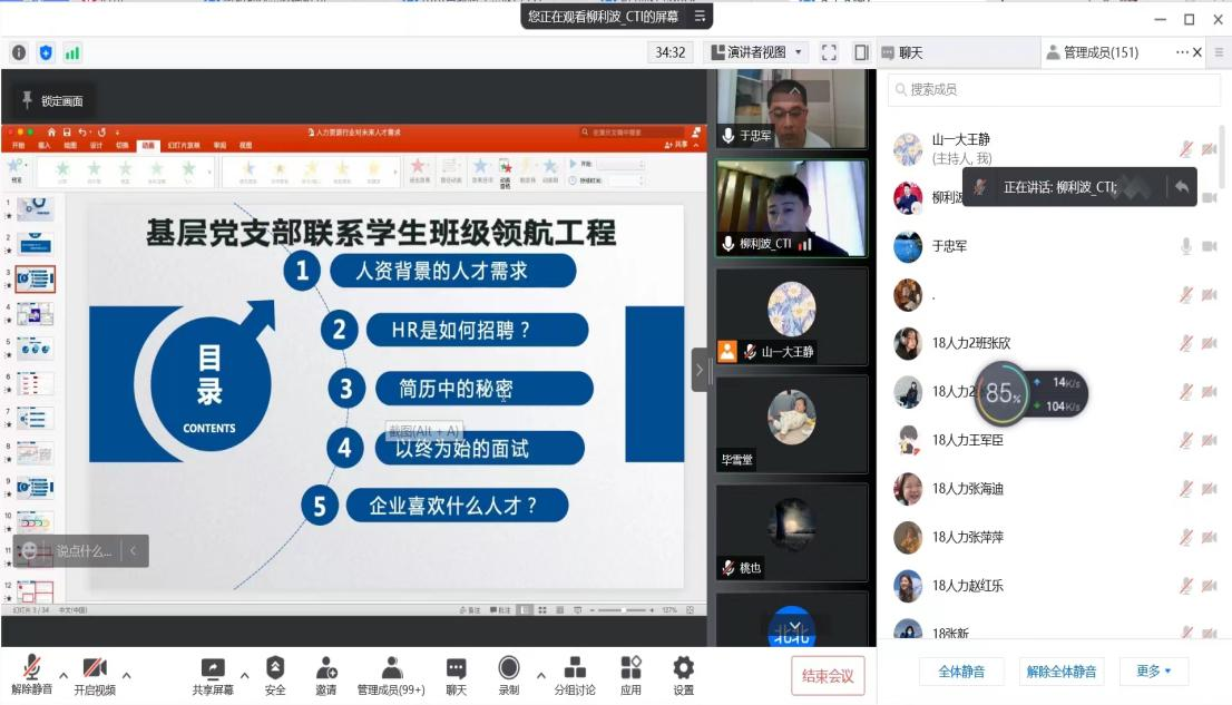 王静首先向同学们简要介绍了校(院)党委实施基层党支部联系员工班级“领航工程”的目的与意义;人力资源系于忠军主任强调了作为HR了解行业发展趋势的重要性。