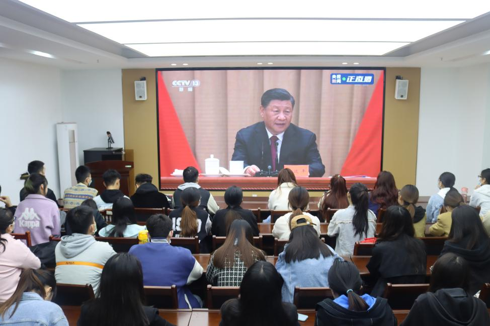 会议伊始,在场同学与大会现场参会人员一道起立、同唱《中华人民共和国国歌》。大会上中共中央总书记、国家主席、中央军委主席习近平发表重要讲话,习近平总书记指出:坚定不移跟党走,为党和人民奋斗是共青团的初心使命。同时肯定了青年在时代中发挥的先进力量以及共青团一百年来坚定理想、矢志不渝形成的宝贵经验,提出了四点希望,激励广大团员青年在实现中华民族伟大复兴中国梦的新征程上奋勇前进。
