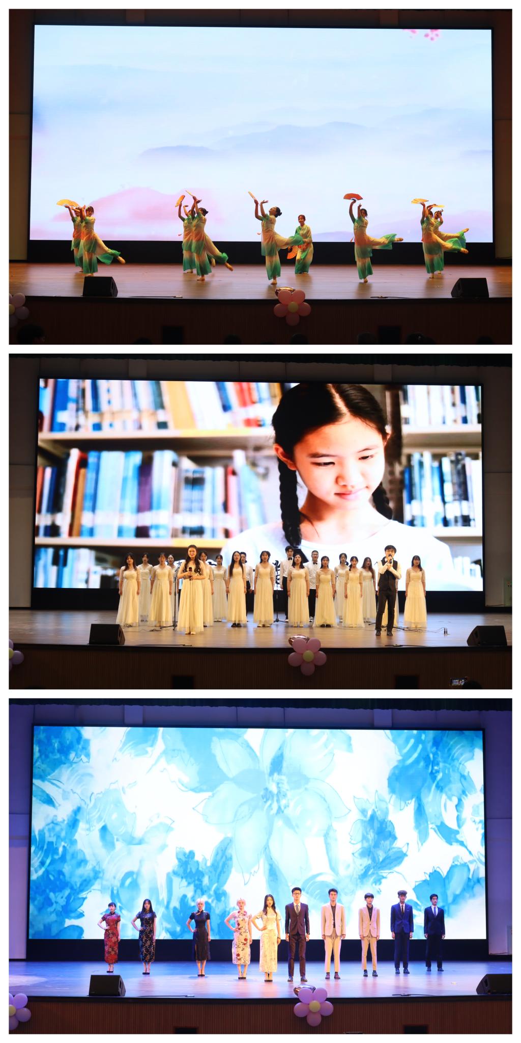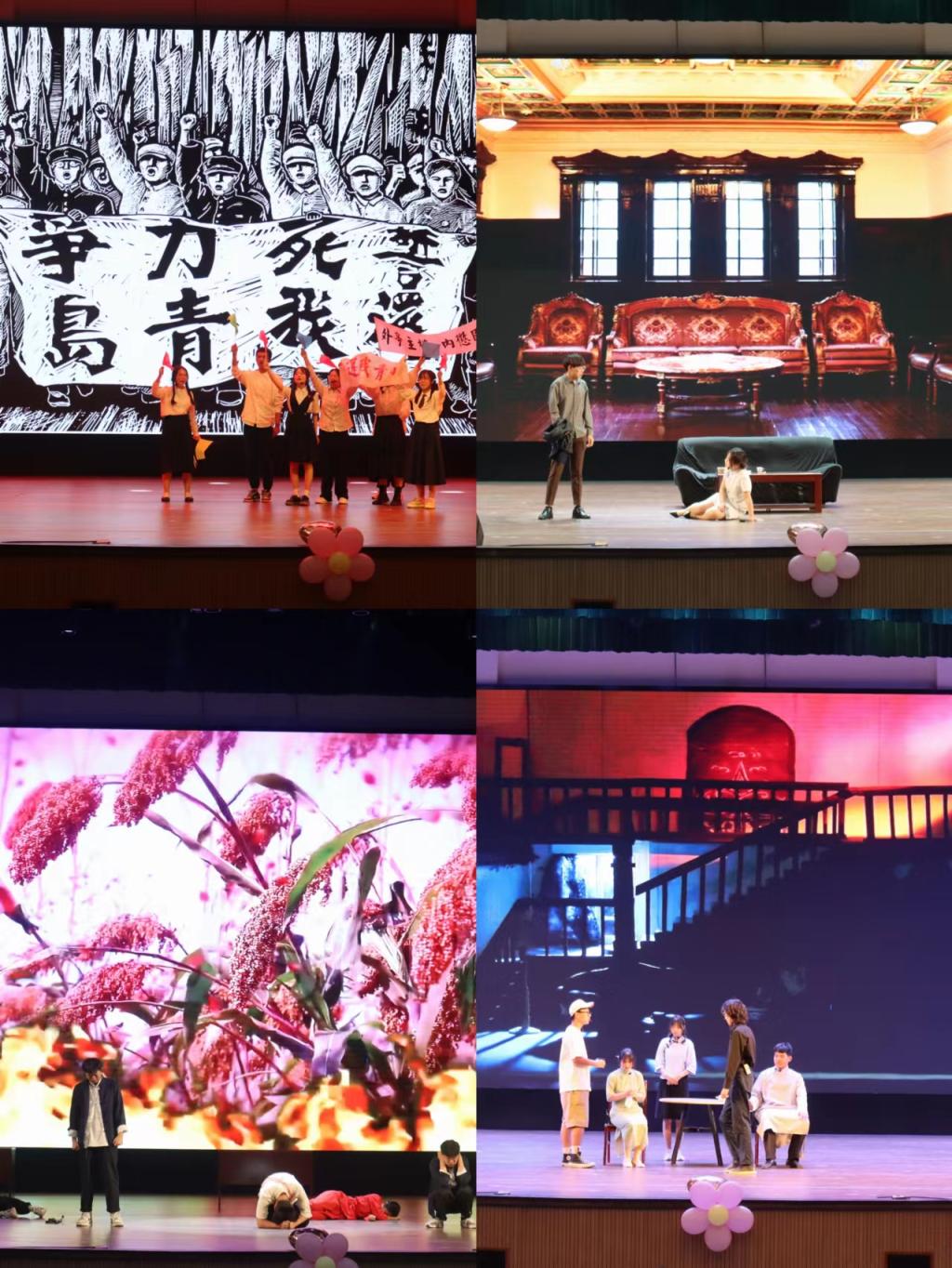 本次活动由石瑞瑛、刘依然、刘书羽等同学带来的舞蹈《醉春风》拉开序幕。第一个节目是由外国语公司曙光队带来的话剧《破晓》,选手们在舞台上的倾情演绎,再现了抗日战争年代全民抗战的革命岁月,赞扬了战士们誓死保卫国家的民族气节和无畏牺牲的奉献精神,彰显了太阳终将升起,革命必然胜利的坚定信念,引来了场上观众的阵阵掌声;第二个节目是口腔医公司红高粱队带来的话剧《红高粱》,簇拥的红高粱似漫天的火烧云,带给观众强烈的视觉感受,一个个色彩鲜明,坚决与侵略者斗争的人物形象跃然于舞台,展现出华夏儿女不屈不挠、英勇抗争的民族精神,尤其是剧中余占鳌不折、不悔、不息的抗日英雄形象令在场观众深受震撼和感动;第三个节目是由韩进、朱子怡、杨子杰等模特协会的表演者带来了模特走秀《Bloom now》,模特们身着传统旗袍与中山装服饰跟随音乐旋律迈着端庄大方的步伐展示着中华传统服饰的优雅魅力,给同学们带来耳目一新的感受;第四个节目是球王会lost stars队带来的《围城》,舞台上同学们精彩绝伦、情感充沛的演绎将经典人物的形象塑造出来,让观众身临其境一般,恍若回到了那个旧时岁月,感受那个时代知识分子的生活和心理的变迁浮沉,带给观众强烈的心理冲击;第五个展示作品是放射公司放射绝队带来的话剧《雷雨》,演员们凭借对剧本的理解将剧中封建思想和阶级矛盾展现的淋漓尽致,通过完美的舞台效果,诠释着话剧艺术的魅力。最后,由通识家苑通识之声合唱团为大家带来了合唱《心系书简》,声韵之间流露出中华传统文化的魅力,比赛在悠扬的歌声中圆满结束。