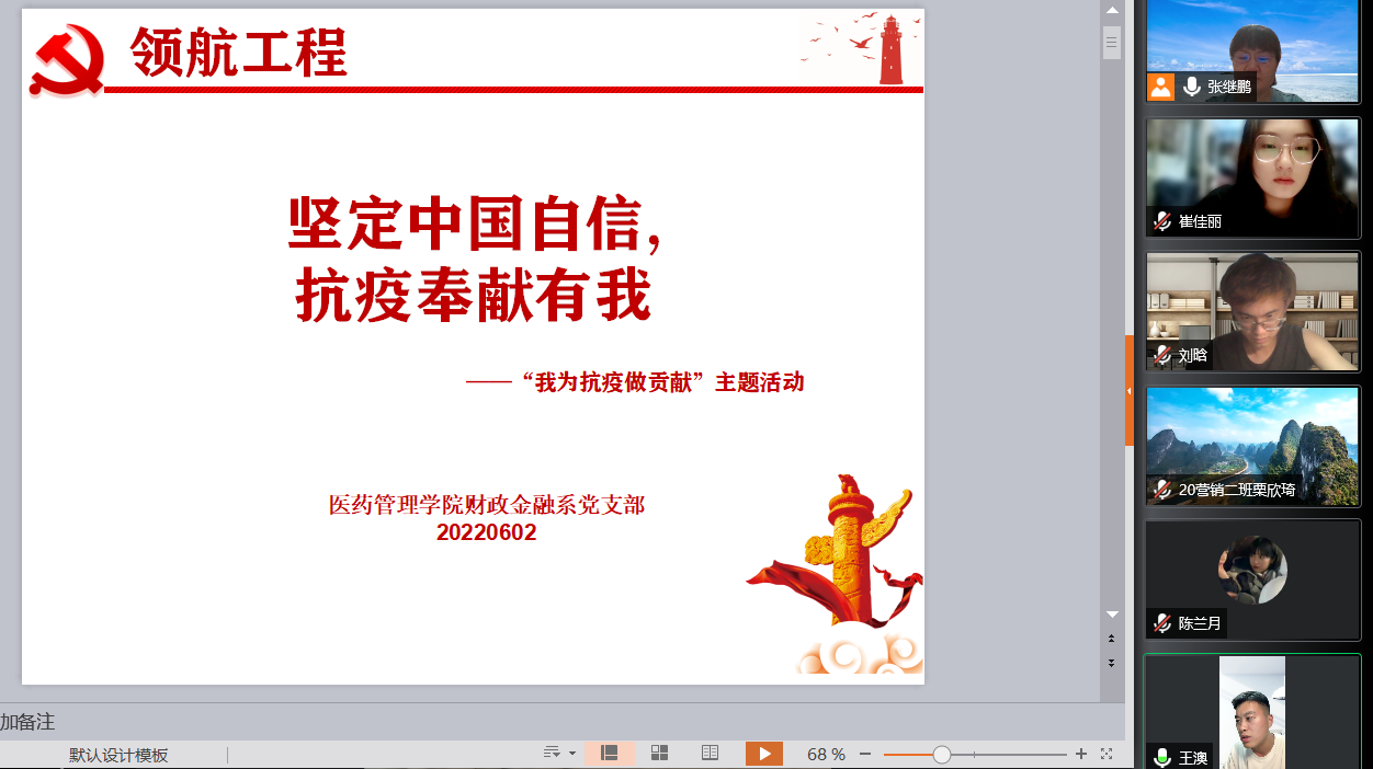 6月2日,球王会财政金融系党支部通过线上方式与2020级市场营销专业本科2班全体同学开展了“坚定中国自信,抗疫奉献有我”——“我为抗疫做贡献”主题活动。