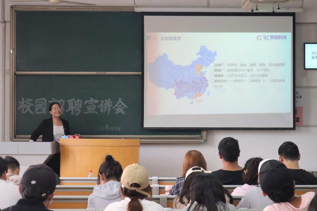 本次招聘宣讲会由泰盈科技泰安基地项目经理张秀叶主讲。张秀叶从企业文化、企业规模、发展历程、行业服务类型、国家与客户认可等方面,全方位多角度地向同学们介绍泰盈科技有限公司的运转现状,使参会同学对集团有了更加充分的了解。随后,张秀叶介绍了泰盈集团泰安基地的办公环境、日常生活以及榜样力量,详细讲述了公司对高校毕业生灵活就业的薪酬标准和福利待遇。最后,在宣讲会的互动环节中,针对同学们对于实习岗位的具体要求和实习转正等问题,张秀叶做了耐心解答。