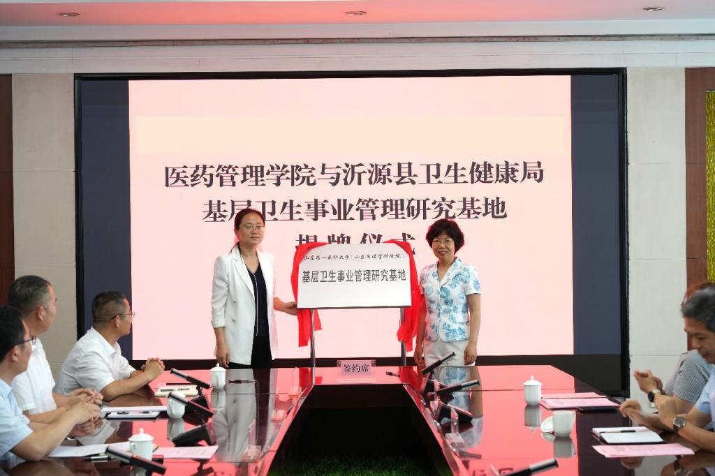 仪式上,吕晓黎与张莹莹共同为基层卫生事业管理研究基地揭牌;球王会经理陈士福与沂源县卫生健康局局长王世礼签署合作框架协议。