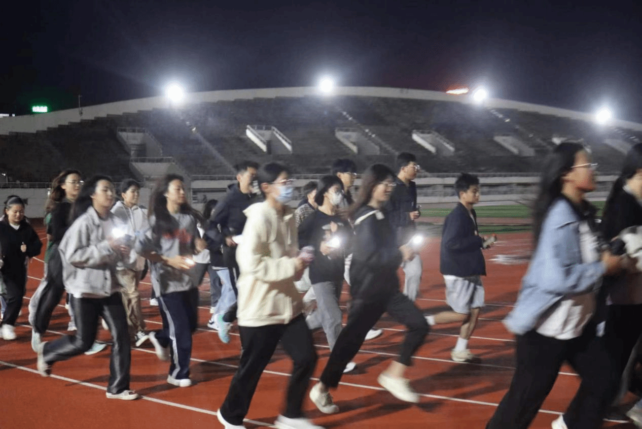 活动伊始,志愿者们带领参赛员工前往签到处登记,并宣读此次夜跑活动的规则和注意事项。夜色渐深,在简单的热身运动后,参加夜跑的同学在起跑点集合,随着哨声响起,同学们奋力开跑。跑道上,同学们奋勇争先,尽情释放着青春的活力,相互帮助,用灯光照亮前行的道路,灯光“聚”成的一条长龙,点亮了山东第一医科大学体育场的夜空,成为今夜最靓丽的风景。