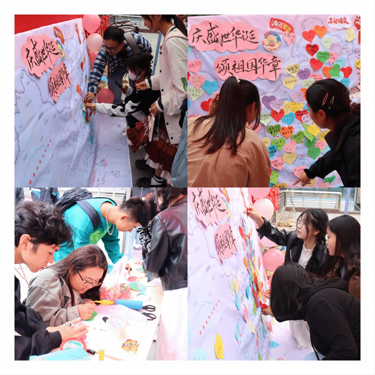 祝福描绘中国图,山一大学子们在爱心便签上书写下对祖国的美好祝福,张贴在画有中国地图轮廓的背景板上,勾勒出祖国的壮丽山河。满满的信笺承载着学子们对祖国深深的爱。通过书法与绘画的方式,山一大学子们将最清澈的爱献给了最伟大的祖国,祝愿祖国的发展越来越好。