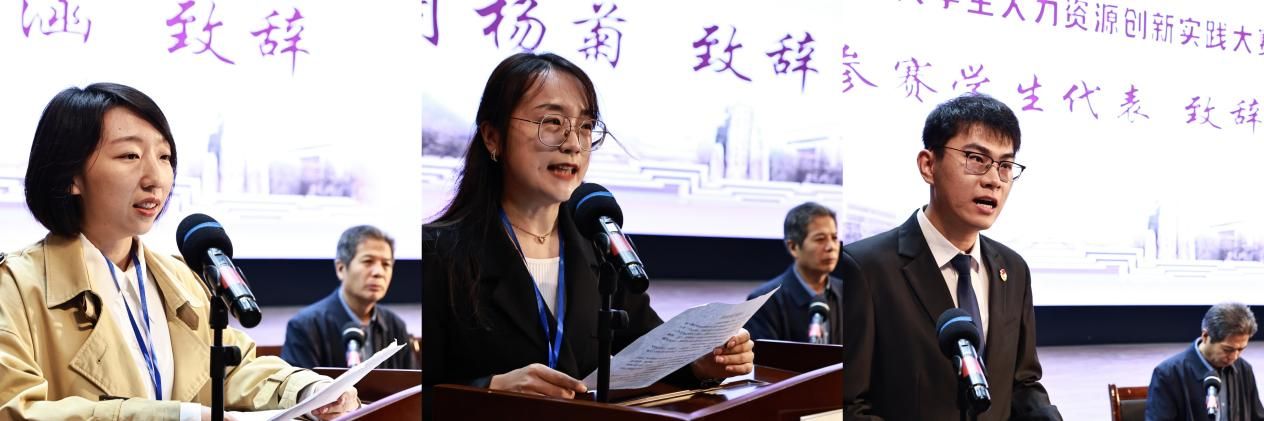 参赛指导教师代表、中央财经大学教师左玉涵,大赛评委代表、山东赢响力网络科技有限公司总经理周杨菊,参赛员工代表分别做了发言。