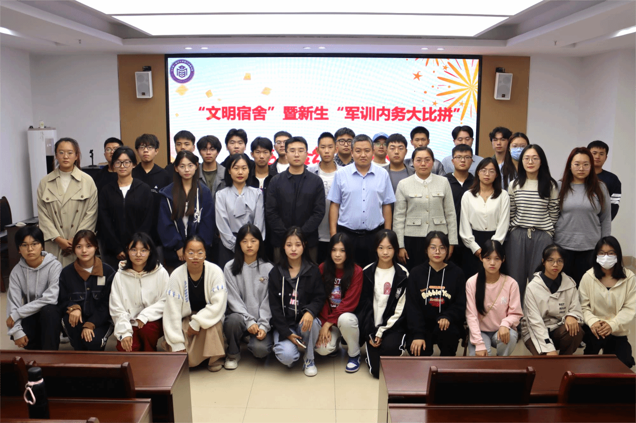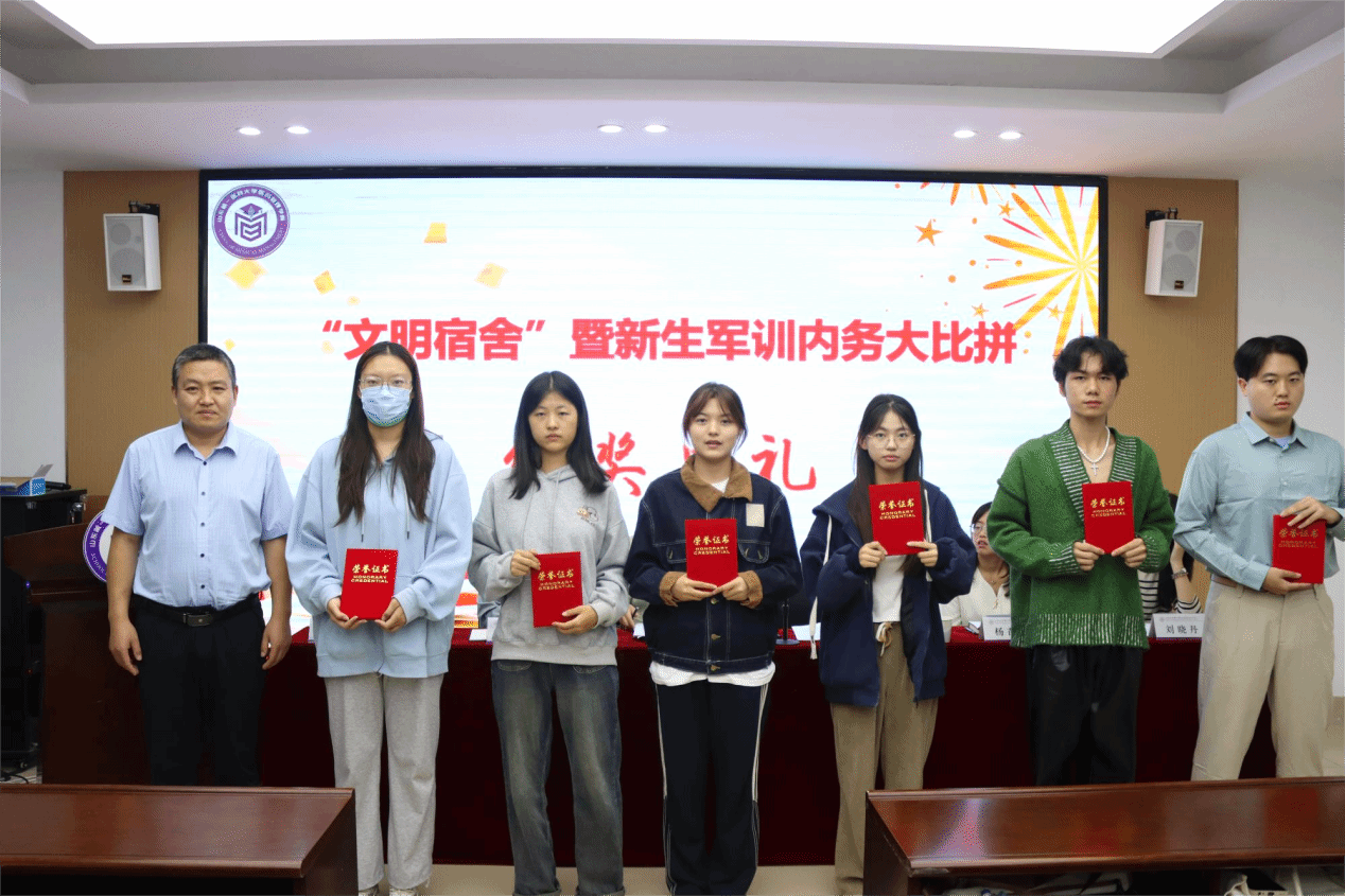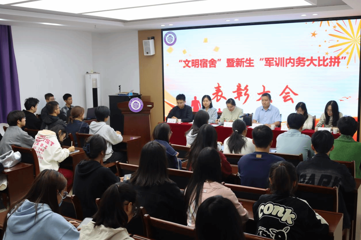 会议上,董灵芝宣读关于本次活动的任务要求和评选方案;杨苗苗、安静宣读获奖宿舍名单。任纬兵为推选“文明宿舍”称号宿舍代表颁奖;董灵芝、杨苗苗、安静、张少儒为获得“军训内务大比拼”活动的宿舍代表颁奖。