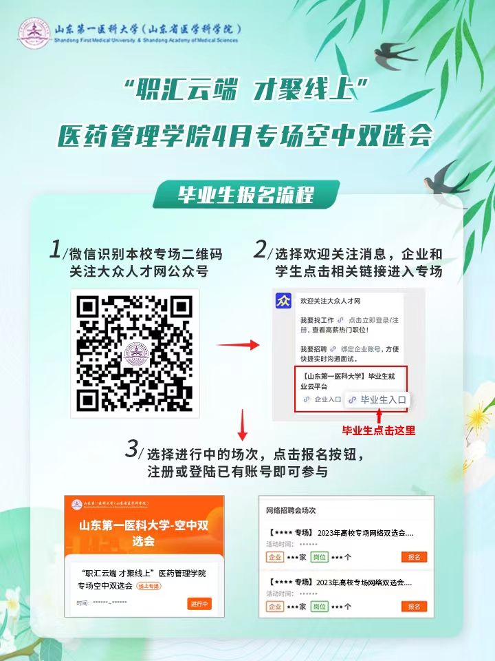 手机微信扫码关注“大众人才网”微信公众号,企业和毕业生分别点击相关按钮进入山东第一医科大公司招专属端口,点击本公司报名按钮,注册或登录已有账号即可直接参与。