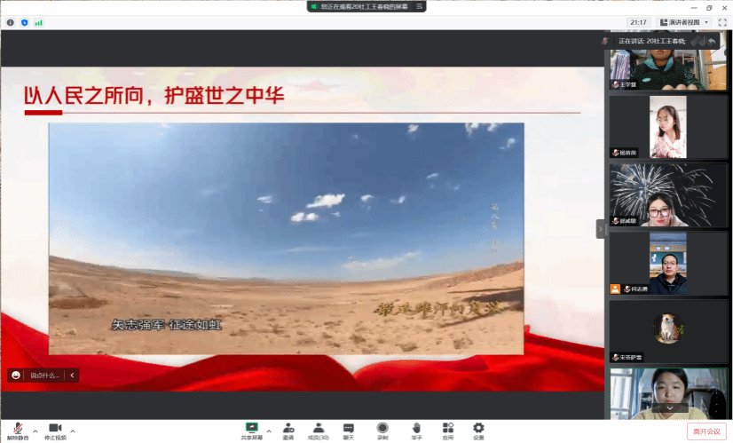 第二环节为同学分享交流。为推动党史学习教育深入青年,培育堪当民族复兴重任的时代新人,确保中国特色社会主义事业继往开来的重要实践路径,全班员工积极响应号召,观看了纪录片《锻造雄狮向复兴》。宋苍萨雪同学以“同心共筑中国梦,继往开来新征程”为主题展开自己的心得分享。